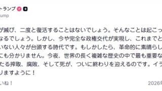 嫌儲 トランプ「今夜、一つの文明が消え去り、二度と蘇ることはないだろう。47年にわたる恐喝汚職そして死は終わりを告げるだろう