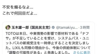 嫌儲 玉木雄一郎「ナフサ不足でTOTOが受注停止。ドミノ倒しで業界全体に波及するかもしれない」→不安を煽るなと大炎上