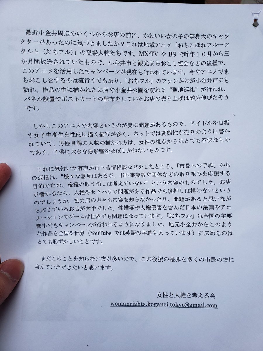 【速報】小金井市、萌え絵の深夜アニメとコラボイベ→抗議団体集結「女性蔑視」「子に悪影響」「人権やセクハラの問題」