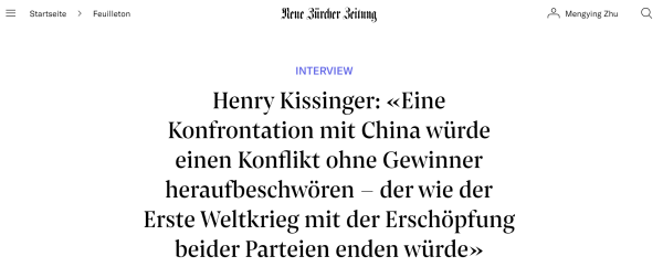 キッシンジャー米元国務長官はこのほど、スイスの新聞社であるノイエ・チュルヒャー・ツァイトゥングの取材に対し、「中国との対決は、勝者のいない衝突を引き起こすことになる」との見方を示しました。