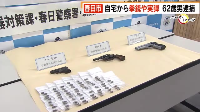 警察の調べによりますと、津田容疑者は2021年5月、春日市の自宅にアメリカ製の回転式拳銃1丁のほかドイツ製の自動装てん式拳銃1丁、それに実弾79発を所持していた疑いが持たれています。