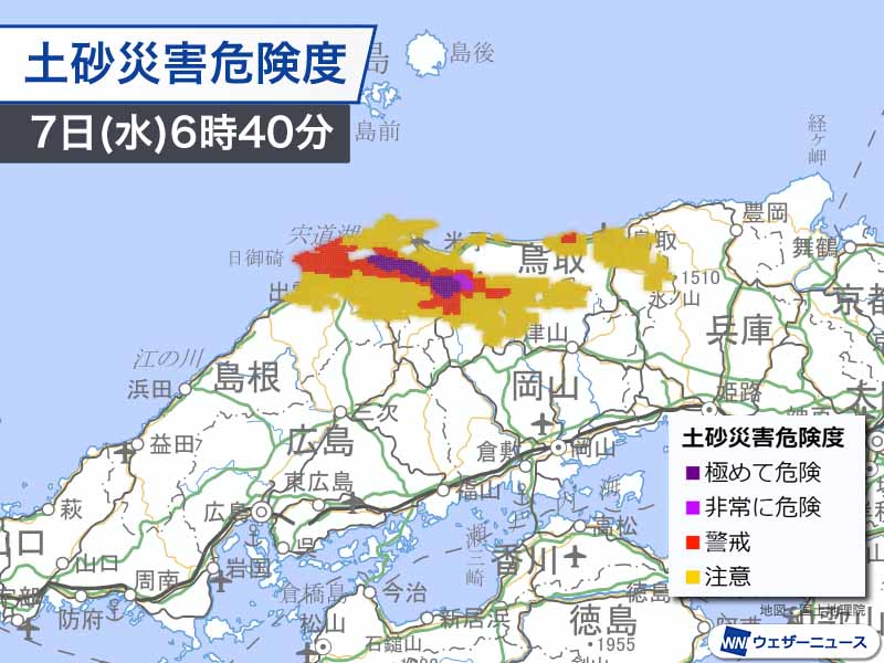 非常に激しい雨によって土砂災害の危険度が急上昇し、6時40分時点では島根県と鳥取県の県境付近で濃い紫色の「極めて危険」なランクに達しています。雨の勢いが弱まっても急な斜面には近づかないようにしてください。