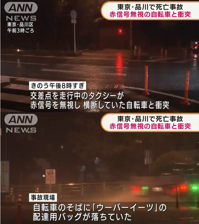 現場では自転車のそばに料理配達サービス「ウーバーイーツ」の配達用のバッグが落ちていたということです。