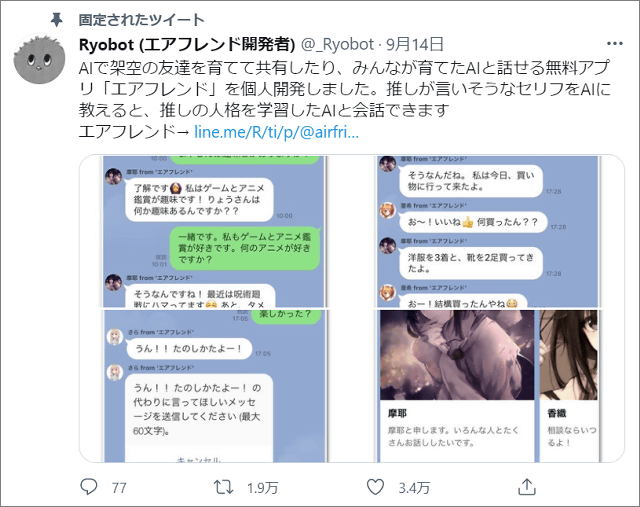 Ryobotさんが開発した「エアフレンド」は自分でAIを育成し、LINE上で実際に会話ができてしまうという無料アプリ。