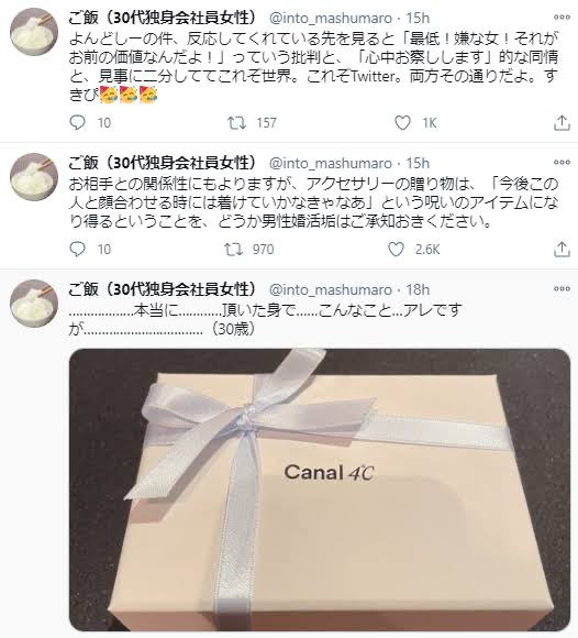 ただこれに対するリプライに「そう4℃は悪くない、悪いのは相手のことを考えてプレゼントを選べない男」ってのが多くて何というか根は深いわ - 22 : 2021/10/27(水) 13:46:04.03 ID:j+KIZ7Dca