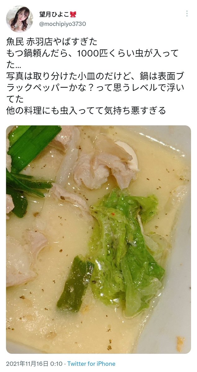 https://pbs.twimg.com/media/FEXaalgacAQf9j0?format=jpg「1000匹くらい入ってた」「吐き気がします」 もつ鍋に大量の虫混入、居酒屋「魚民」運営会社が謝罪