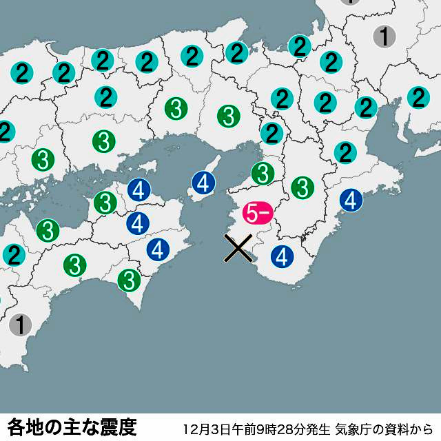 懸念されている南海トラフ巨大地震のような、海側と陸側の「プレート境界地震」とはメカニズムが異なる。震源の深さは18キロで、プレート境界よりも浅いところで発生していた。マグニチュード(M)5・4と巨大地震よりはずっと規模も小さく、津波の恐れもなかった。気象台は「南海トラフ地震の可能性が平常より高まっているとは考えていない」と説明した。