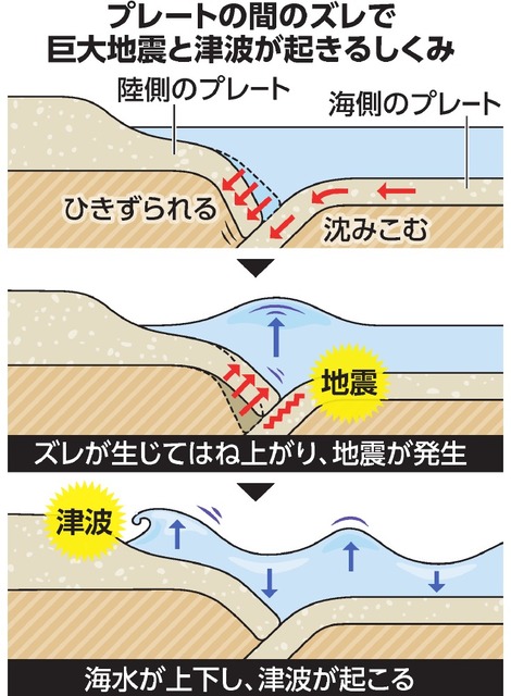 ただ、今回の地震を引き起こしたプレート内部での岩盤破壊も、おおもとをたどれば、巨大地震につながる陸側のプレートのひずみに原因がある。紀伊半島の地下では、太平洋側から来た海側のプレートが、陸側のプレートの下に沈み込んでいる。