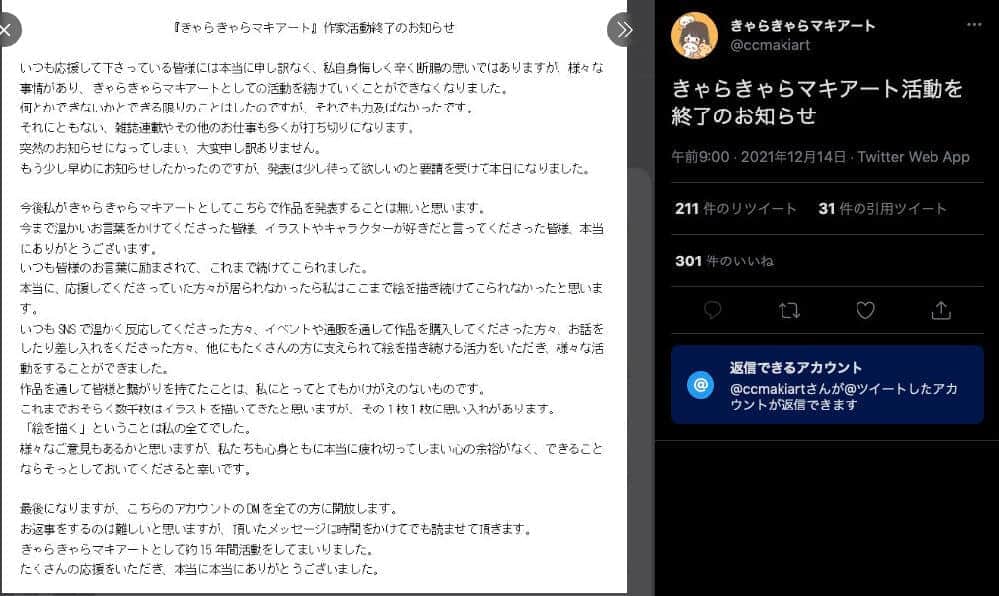 きゃらきゃらマキアートは14日、ツイッターで「作家活動終了のお知らせ」を掲載。「様々な事情があり、きゃらきゃらマキアートとしての活動ができなくなりました」と、15年間の活動を終える旨を伝えた。
