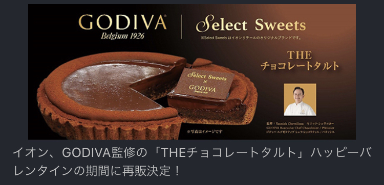 イオンは、2月9日〜2月14日の期間中、「イオン」「イオンスタイル」等最大約400店舗にて、ベルギー創業のチョコレートブランドGODIVA監修の「THEチョコレートタルト」を再度販売する。店舗により販売開始日は前後する。再販が決定した「GODIVA監修 THE チョコレートタルト」は、チョコスフレを流し込み香ばしく焼き上げたタルトをベースに、濃厚なチョコレートガナッシュと、バランスの取れたソフトな味わいのグラサージュ(チョコレートコーティング)を掛け、贅沢な3層仕立てたチョコレートタルト。