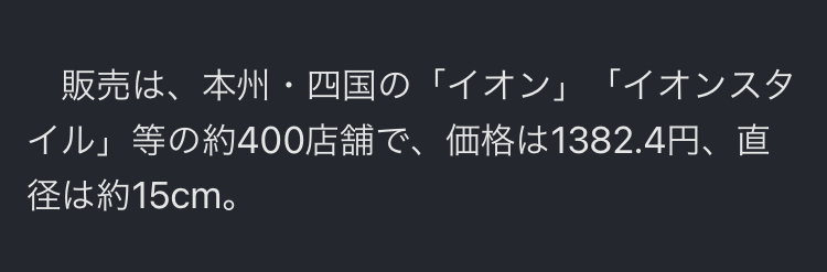 販売は、本州・四国の「イオン」「イオンスタイル」等の約400店舗で、価格は1382.4円、直径は約15cm。