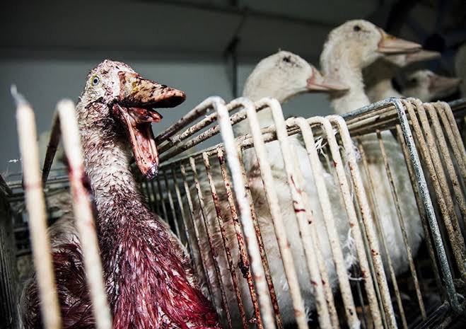 この残忍な処理は鳥の健康を破壊する。3~4週間で、彼らの肝臓は標準サイズの10倍に膨れあがる。