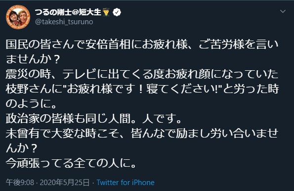 つるの剛士「震災の時、枝野さんに”寝てください!”と労った時のように安倍首相にご苦労様を言いませんか?」