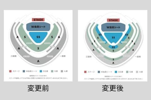 ところが、変更後の座席レイアウトでは、「W会員シート」こそ変更なかったものの、「SS席」はアリーナ席のほかに1階スタンド席の一部を追加、「S席」は1階スタンド席のほかにバルコニー席全席と2階スタンド席の一部を追加、「A席」はバルコニー席がなくなり2階スタンド席のみとなった。