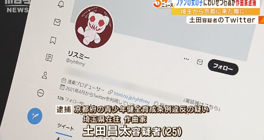 2022/5/31 18:55中学3年の女子生徒(14)にわいせつ行為をしたとして、京都府警は31日、府青少年健全育成条例違反(淫行など)の疑いで、埼玉県川口市の作曲家、土田昌太容疑者(25)を逮捕した。容疑を認めているという。