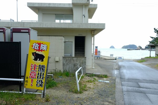 海辺近くに設置された、クマの出没に注意を呼び掛ける看板(舞鶴市三浜)
