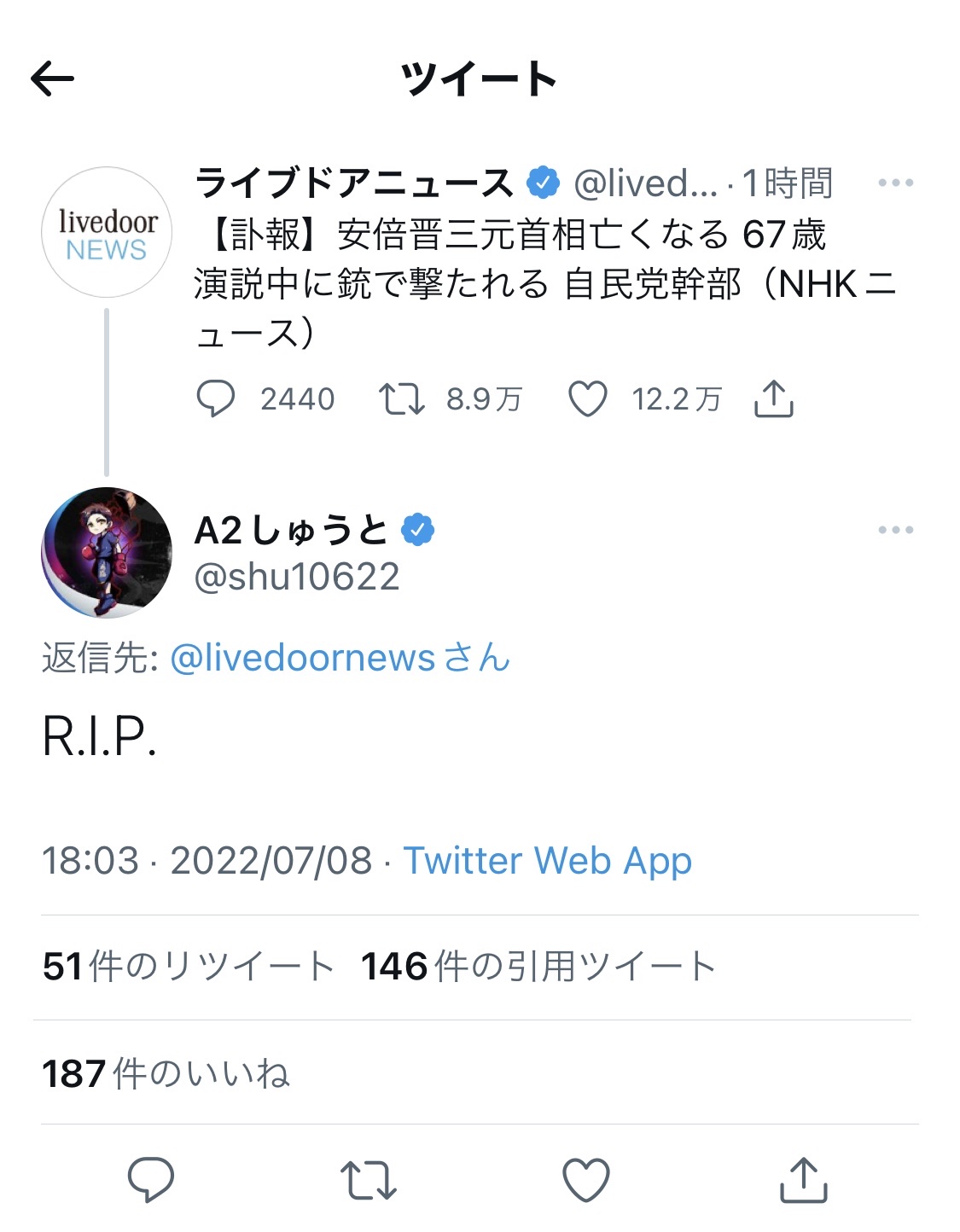 御冥福くらいの意味か、なるほど - 12 : 2022/07/08(金) 19:06:10.584 ID:2hzezdQqa