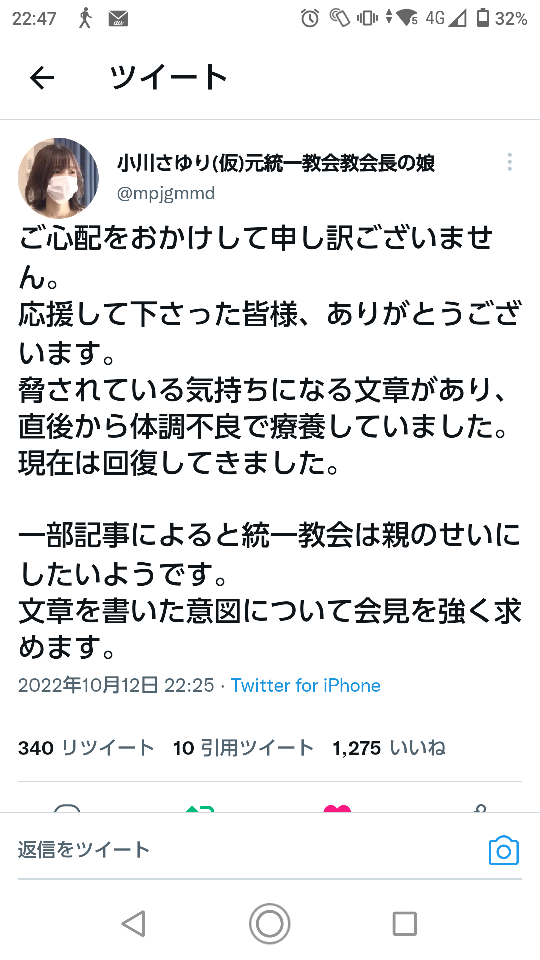 現在は回復してきました。一部記事によると統一教会は親のせいにしたいようです。