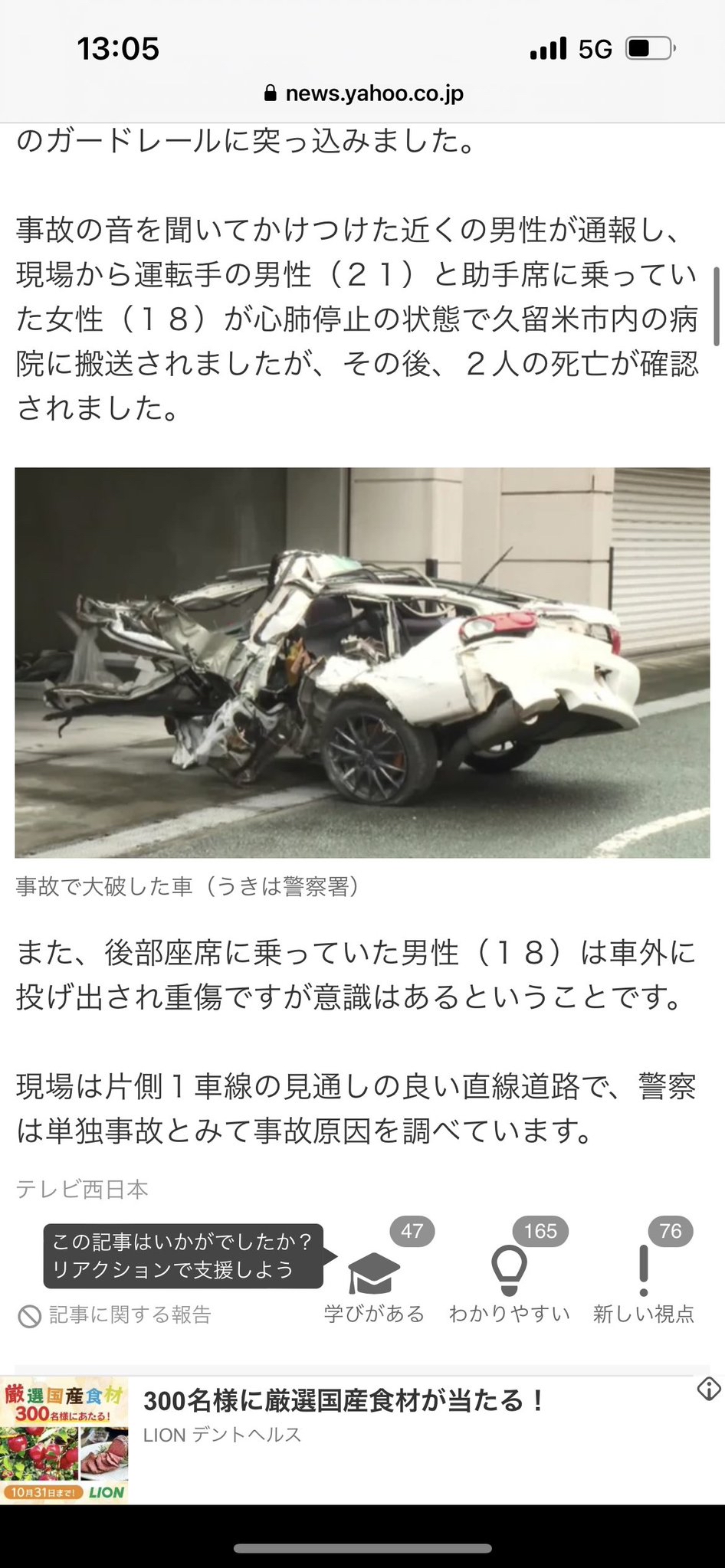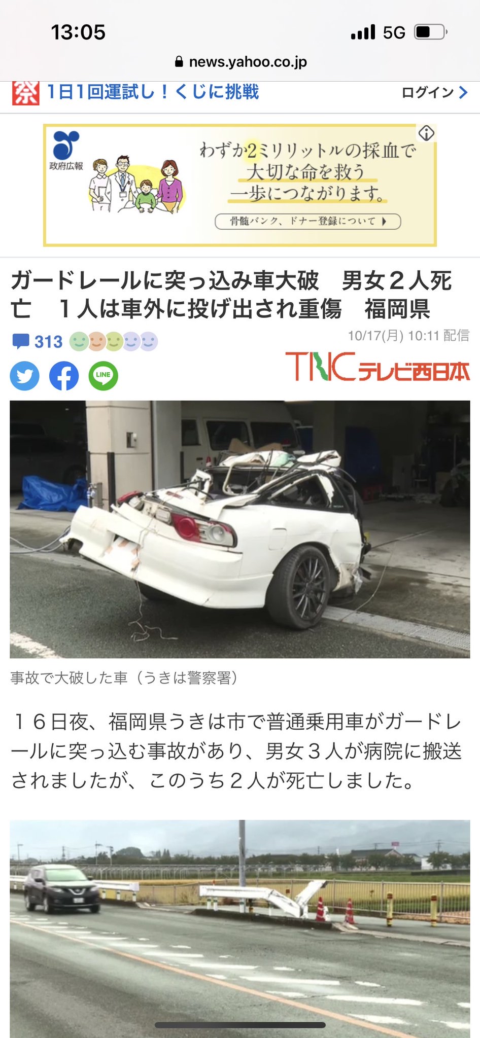 ガードレールに突っ込み車大破 男女2人死亡 1人は車外に投げ出され重傷 福岡県