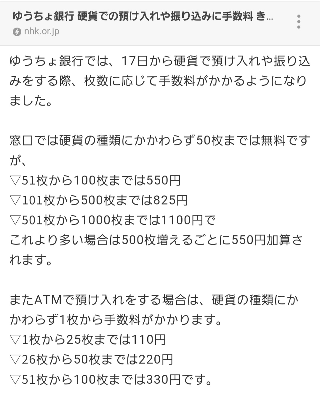 なるほど、大量の硬貨の入金時に手数料がかかる金融機関が増えている。りそな銀行が2019年に「大量の硬貨入金の事務手続きの対価」との理由で導入したのを皮切りに、都市銀行が相次いで設定。このため、ゆうちょ銀行に一時期、硬貨の入金が殺到したが、ゆうちょでも今年1月中旬から手数料がかかるようになった。 - 8 : 2022/12/29(木) 21:19:00.49 ID:KmmqbFqe0NIKU