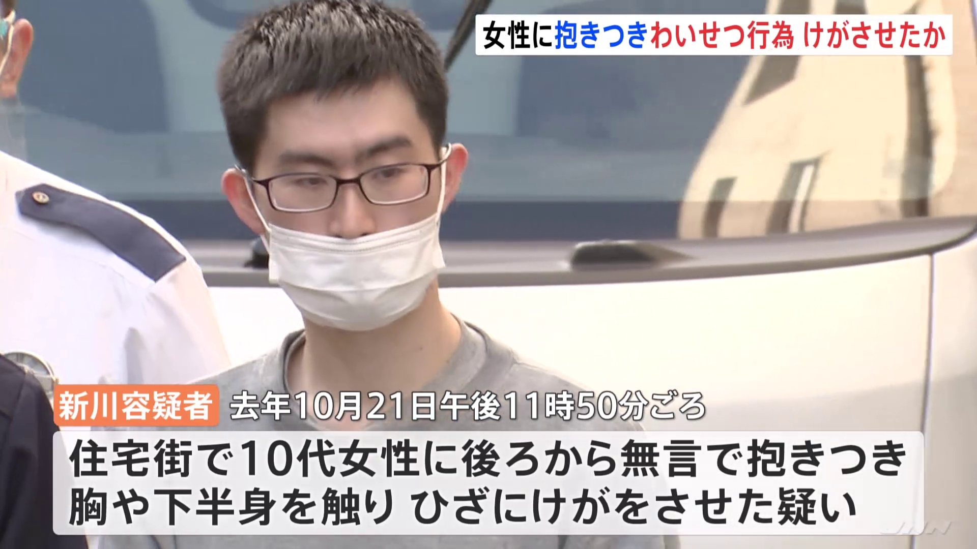 東京・東村山市の自称アルバイト・新川拓哉容疑者(25)は、去年10月21日の深夜、東村山市の住宅街で10代の女性に後ろから無言で抱きつき、胸や下半身を触ったうえ、膝にけがをさせた疑いがもたれています。