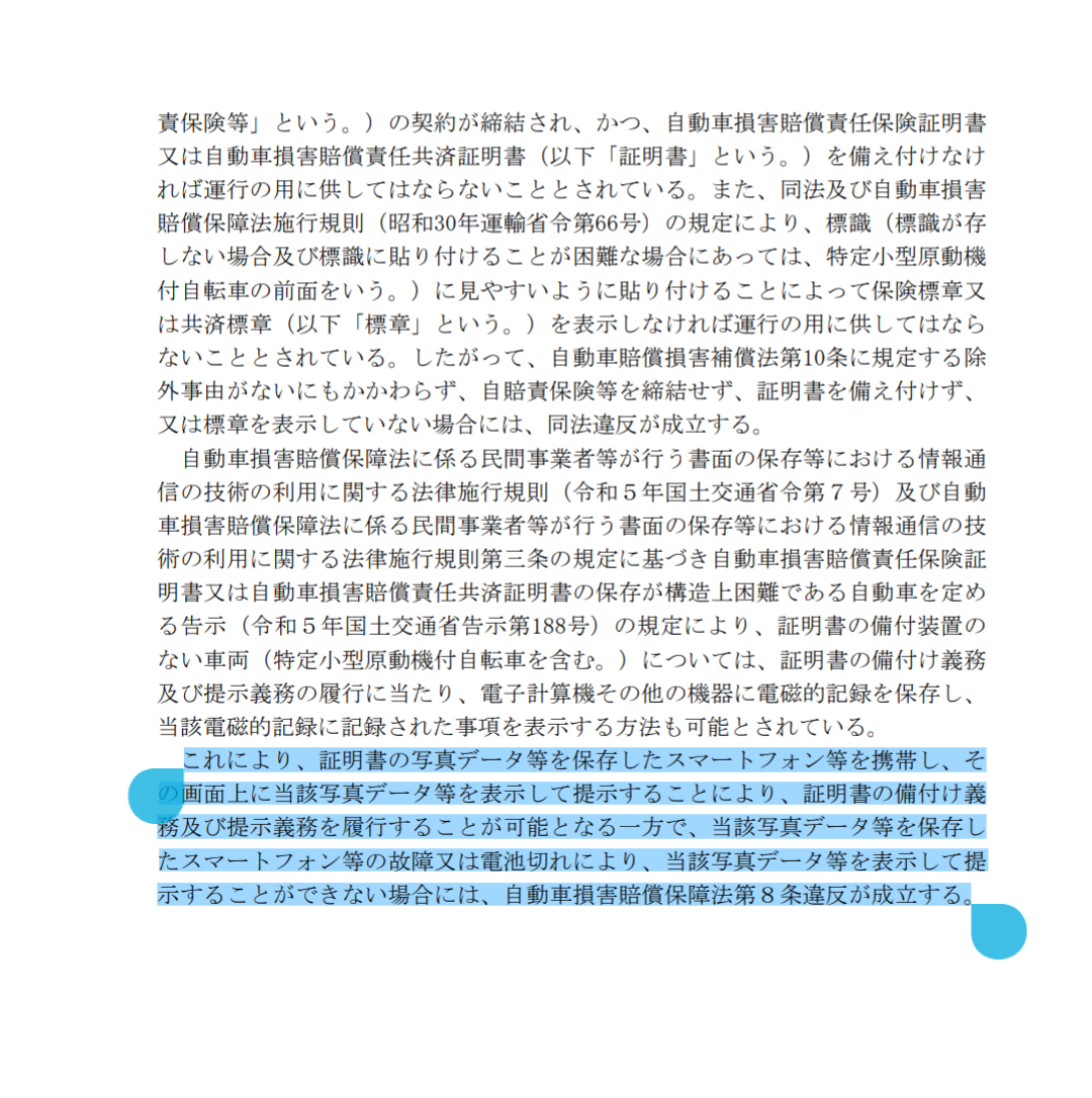 これにより、証明書の写真データ等を保存したスマートフォン等を携帯し、その画面上に当該写真データ等を表示して提示することにより、証明書の備付け義務及び提示義務を履行することが可能となる一方で、当該写真データ等を保存したスマートフォン等の故障又は電池切れにより、当該写真データ等を表示して提示することができない場合には、自動車損害賠償保障法第8条違反が成立する。