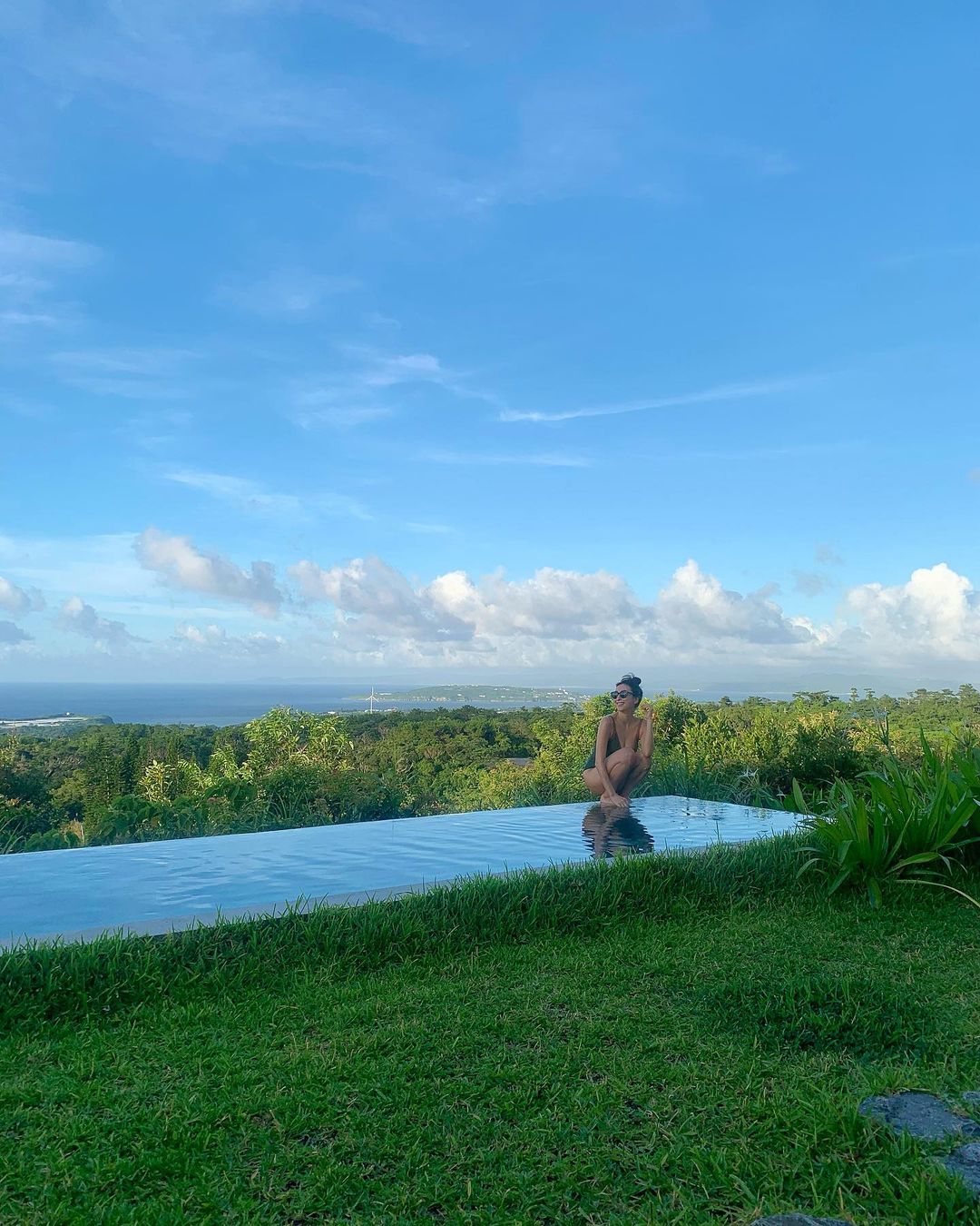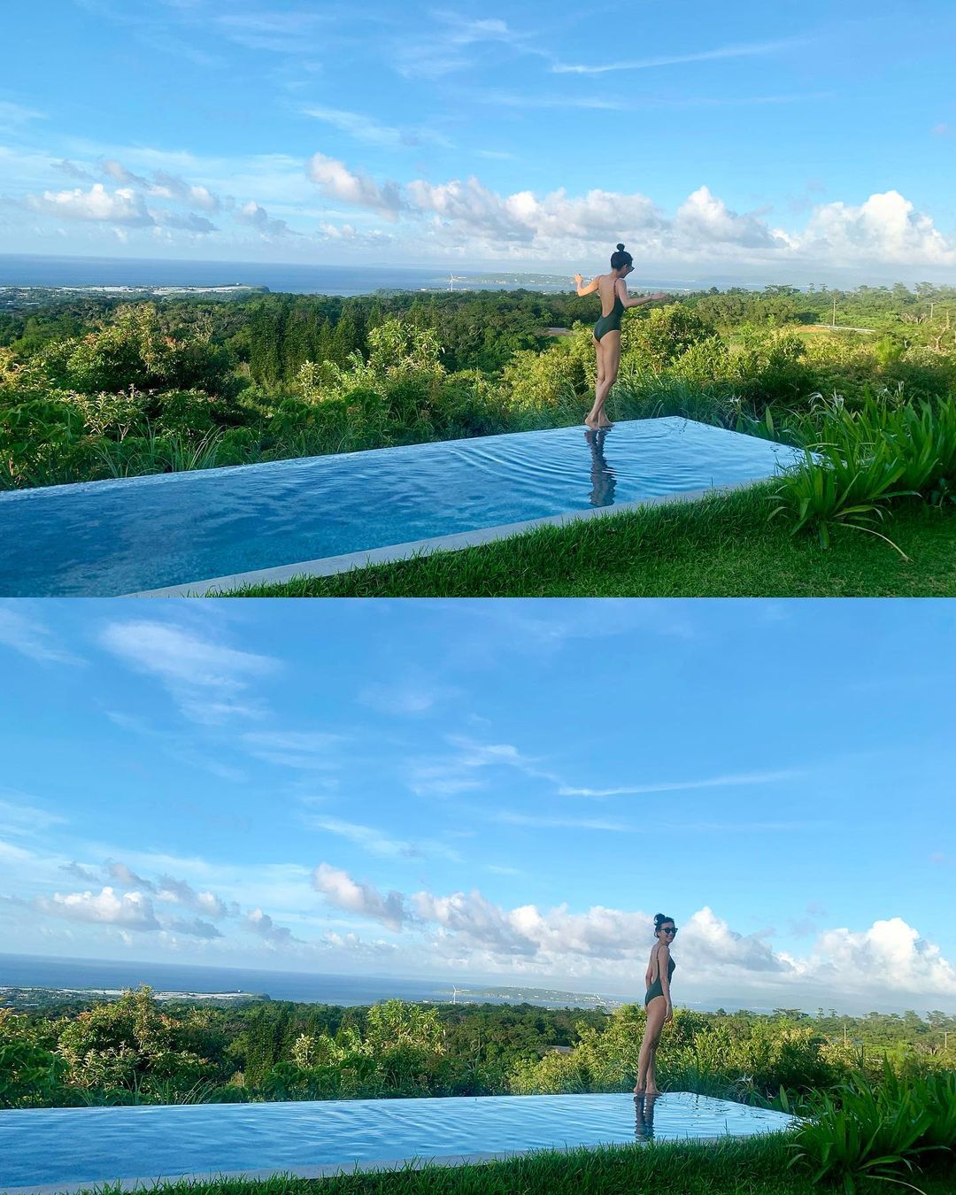 「泳げない」とハッシュタグをつけて投稿した浅田。緑の中にあるプールサイドを水着で歩くショットや、大量のフルーツが並んだテーブル写真などをアップ。