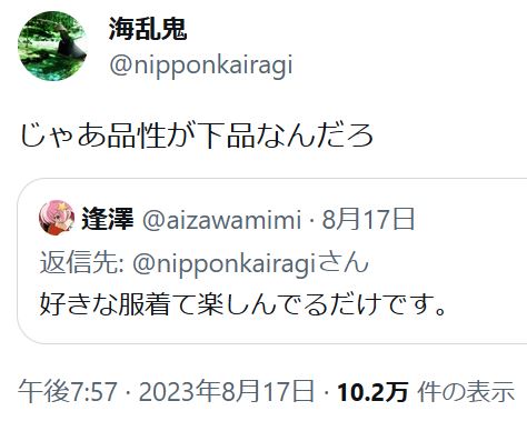 下品の極みな事言いつつ他人の品性を言及する恥知らず