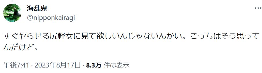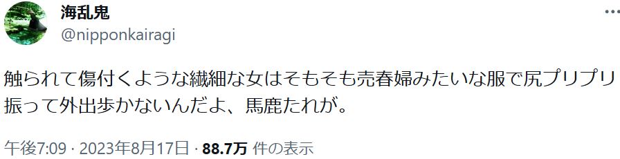 そんな建前を吹き飛ばす女性蔑視の誹謗中傷がきた - 46 : 2023/08/19(土) 18:20:38.60 ID:wr2TQq1w0