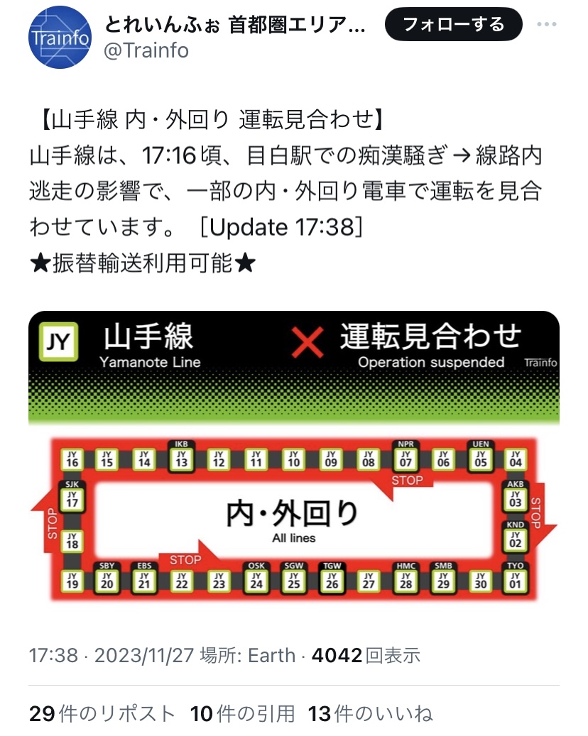 目白で線路内に逃走したんなら埼京線と湘南新宿ラインは止めんでええの?