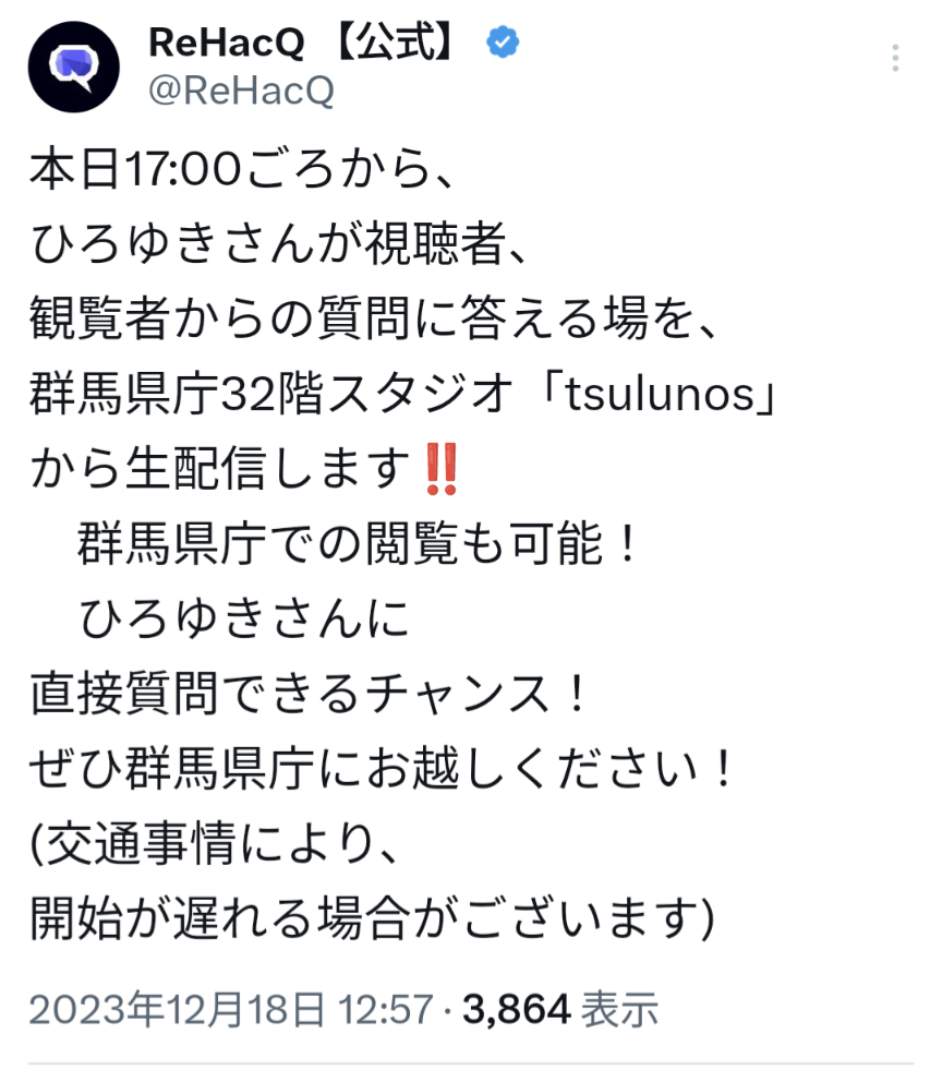 ひろゆき本日17時に群馬県庁32階スタジオ「tsulunos」に現る。直接質問できるチャンスなのできてください。