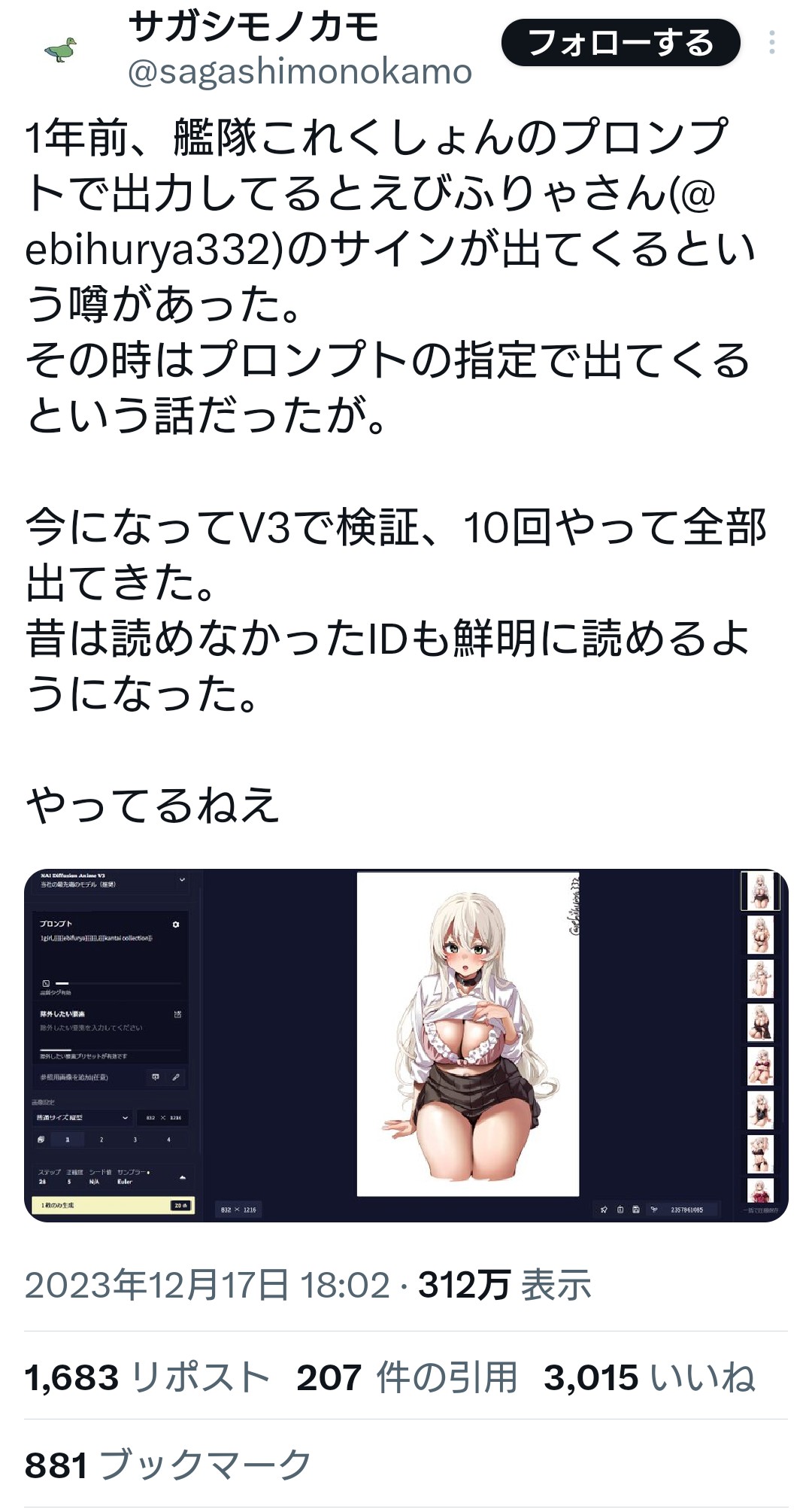 過学習というか、プロンプトにイラストレーターの名前入れたらそのイラストレーターが毎回入れてるサインが出ましたってオチや - 80 : 2023/12/21(木) 08:17:29.13 ID:RI2mIS3+M