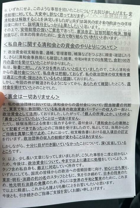 下村氏によると、22年4月に安倍晋三会長(当時)が、幹部だった塩谷立氏、下村氏、西村康稔氏、世耕弘成氏の4人と会合を開いた際、還流を廃止する方針を示した。