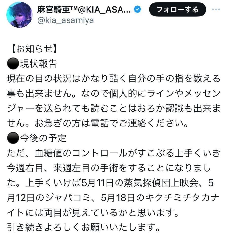 また、同じ投稿の中で「今後の予定」も明かしており、「ただ、血糖値のコントロールがすこぶる上手くいき今週右目、来週左目の手術をすることになりました」と綴り、「上手くいけば5月11日の蒸気探偵団上映会、5月12日のジャパコミ、5月18日のキクチミチタカナイトには両目が見えているかと思います」と、イベントへの参加にも意欲を見せている。