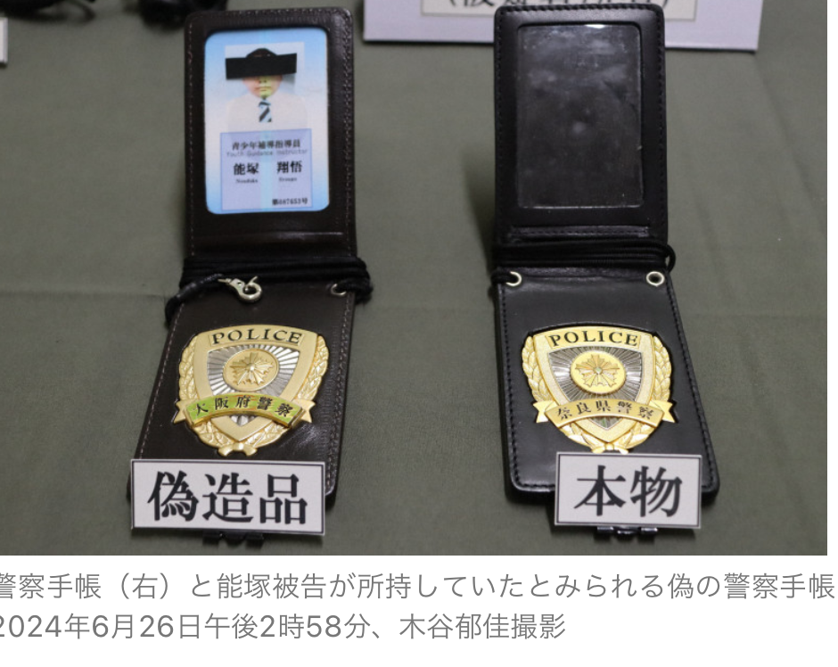 逮捕容疑は、記章のレプリカが付いた警察手帳のようなものに、大阪府警の文字を刻印した金属プレートを貼り合わせるなどして、記章を偽造。4月17日に堺市西区の浜寺公園にいた20代男性4人のグループに、作成した偽の警察手帳を見せて職務質問を装い、名前や電話番号を聴取したとしている。