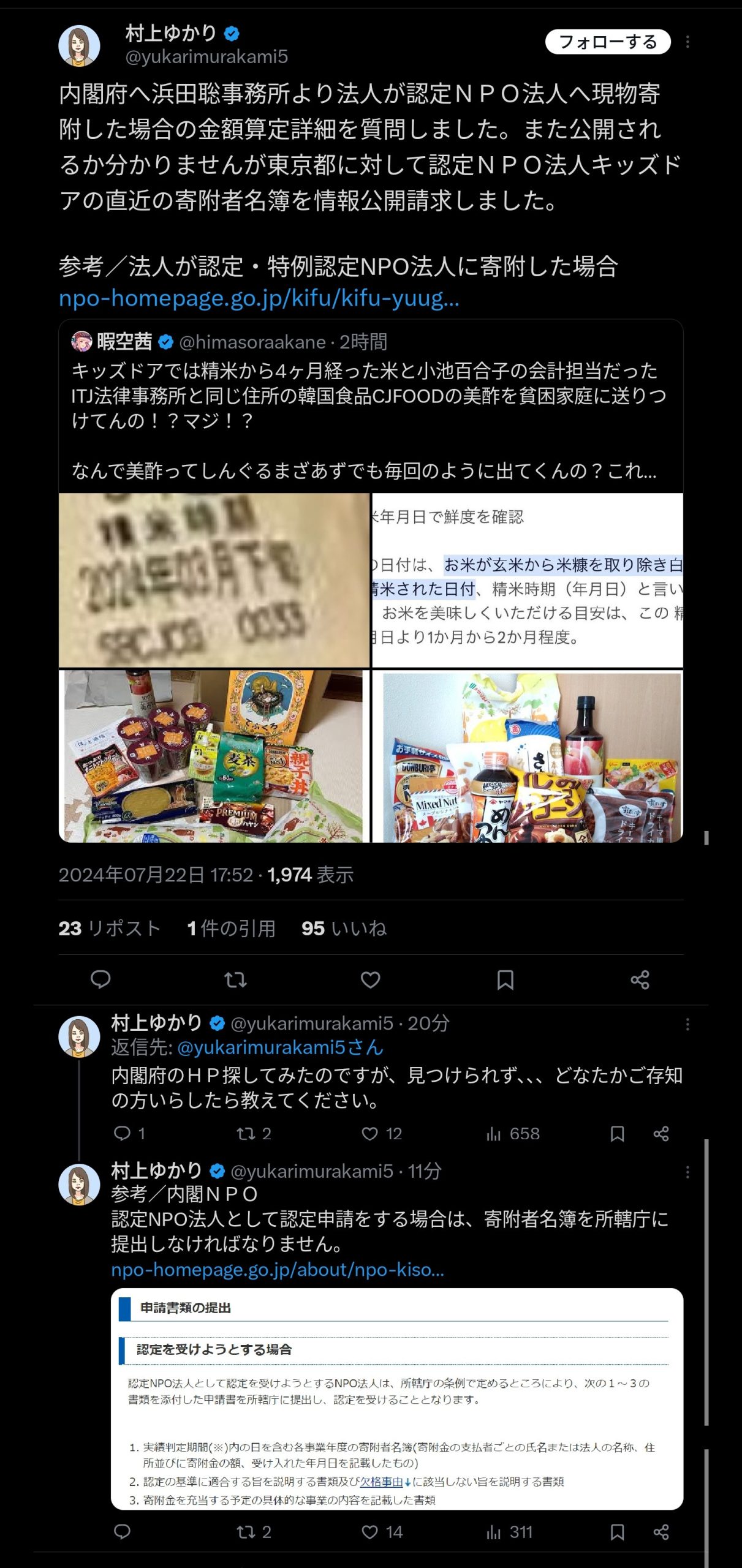 キッズドアでは精米から4ヶ月経った米と小池百合子の会計担当だったITJ法律事務所と同じ住所の韓国食品CJFOODの美酢を貧困家庭に送りつけてんの!?マジ!?