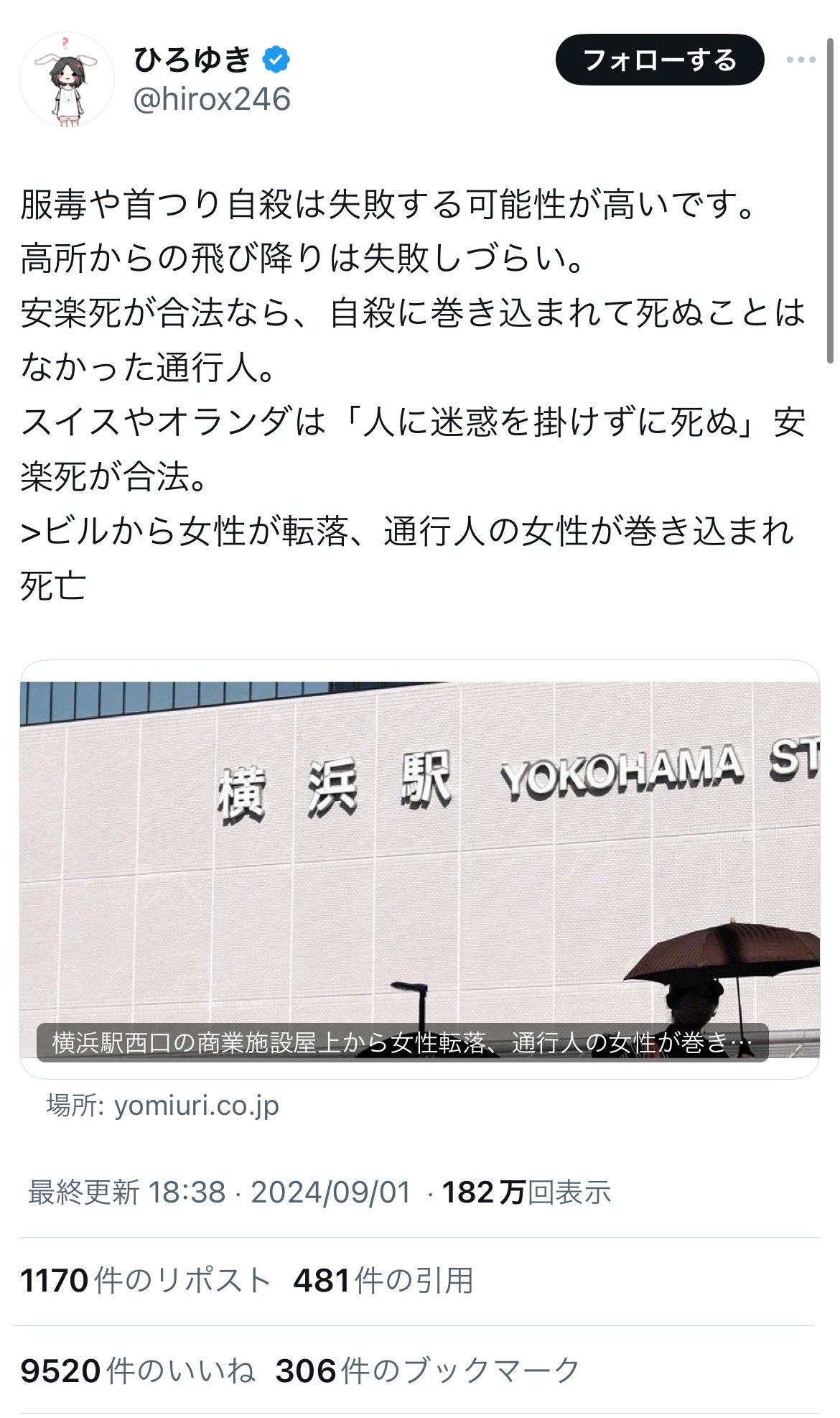 ひろゆき、安楽死に肯定的な模様「安楽死があれば通行人は自殺に巻き込まれて死ななかった」