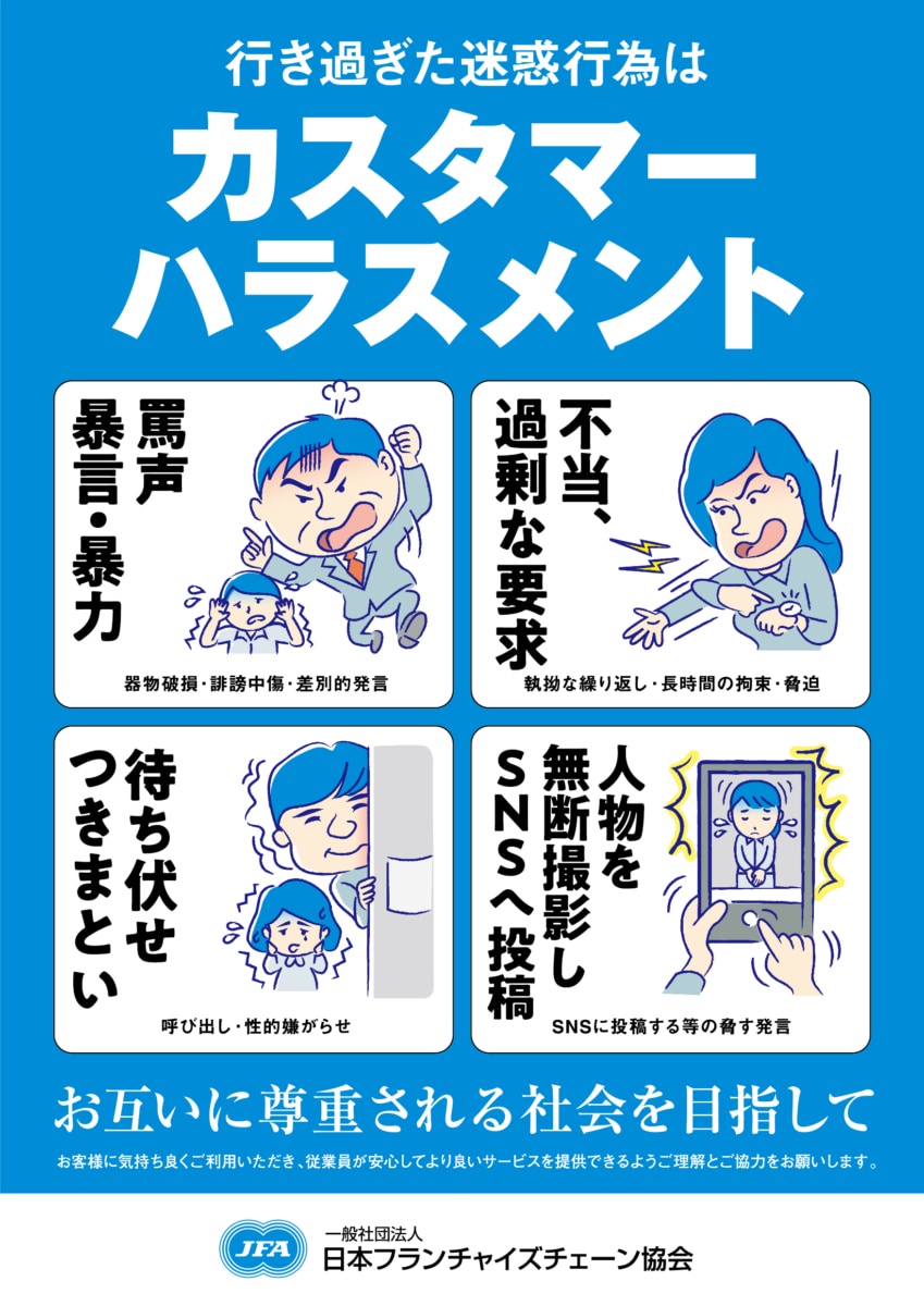 まず、店舗のカウンター付近に日本フランチャイズチェーン協会作成のポスターを掲示する。顧客に店舗を気持ちよく利用してもらい、従業員が安心してより良いサービス提供に注力できるようにするため、カスハラの具体例を告知ポスター内に示した。