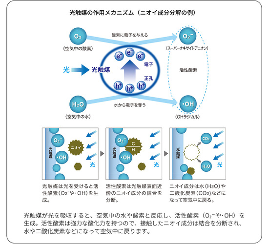 光触媒は、光が当たると表面に強い酸化力が発生し、接触するニオイ成分や菌、ウイルスなどを酸化分解する。これにより、タバコやペット、トイレなどの気になる生活臭を低減するほか、付着する雑菌・ウイルスの作用を抑制する。
