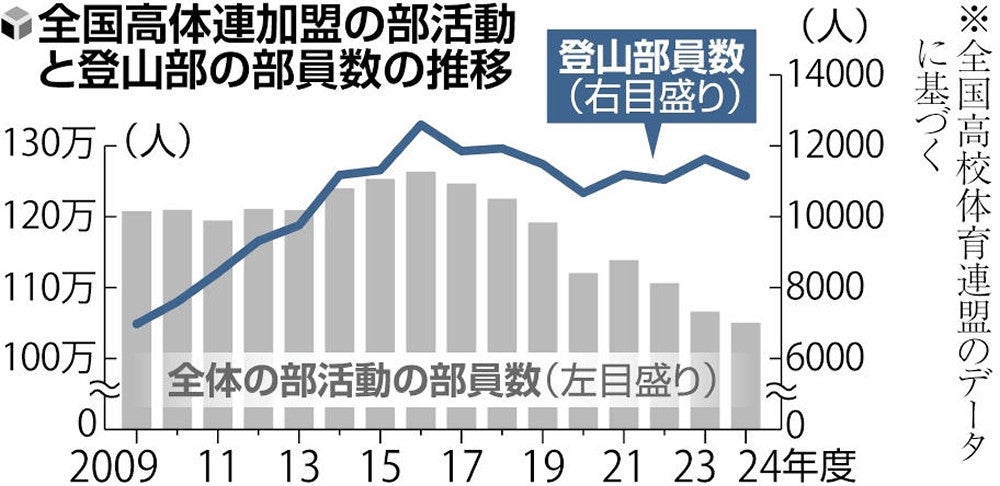 【グラフ】 全国高体連加盟の部活動と登山部の部員数の推移(写真:読売新聞)