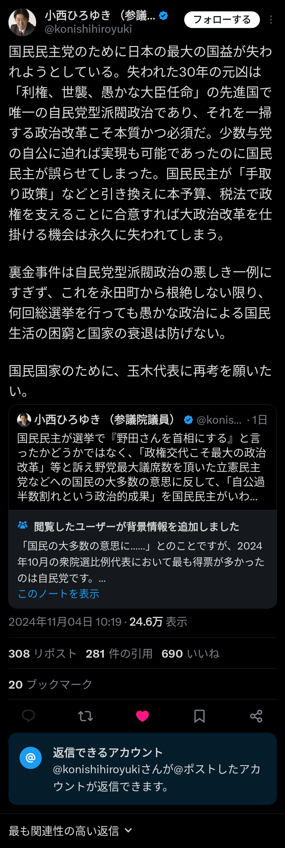 【正論】立憲・小西ひろゆき議員「国民民主党のせいで政権交代という最大の国益が危機に瀕してる。失われた30年を続ける気か」