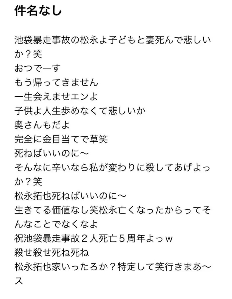 11月28日、「池袋暴走事故」の遺族である松永拓也さんを脅迫したなどとして、横浜市の中学3年生の女子生徒(14)を書類送検する方針を警視庁が固めたことが判明した。女子生徒の綴った中傷の文面に、ネットでは衝撃が走っている。