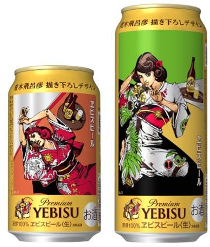 「デザイン缶、出ます」と紹介したのは、作者の荒木飛呂彦が書き下ろしたデザインのサッポロビール「ヱビスビール」の缶。ヱビスビールお馴染みの美人画を現代風にアレンジ。着物姿のキャラクターが大胆に描かれている。