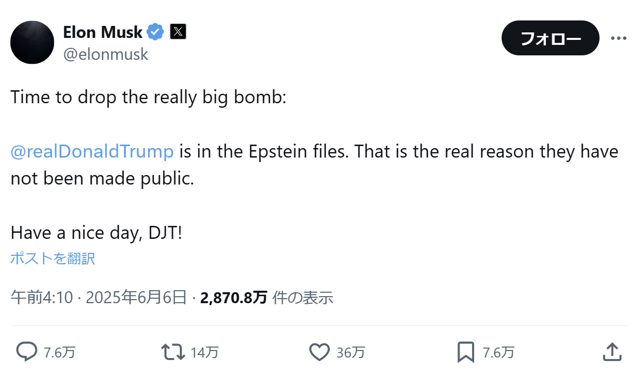 イーロン・マスク氏「爆弾投下の時が来た。トランプ氏はエプスタインファイルに含まれている。だからあのリストは公開されない。」