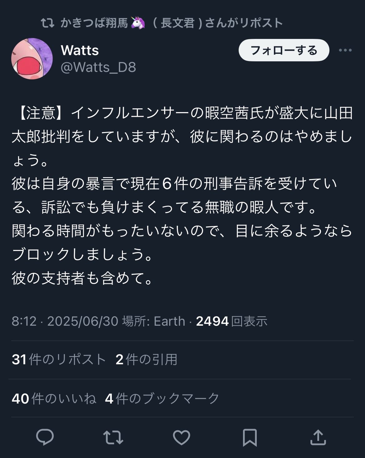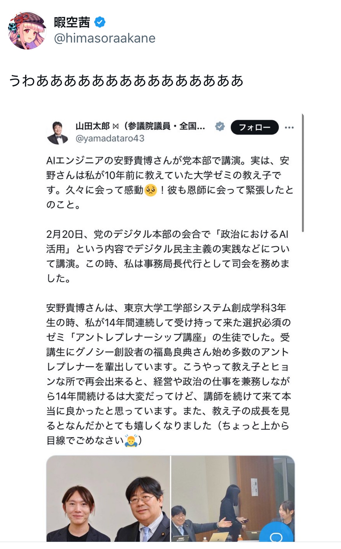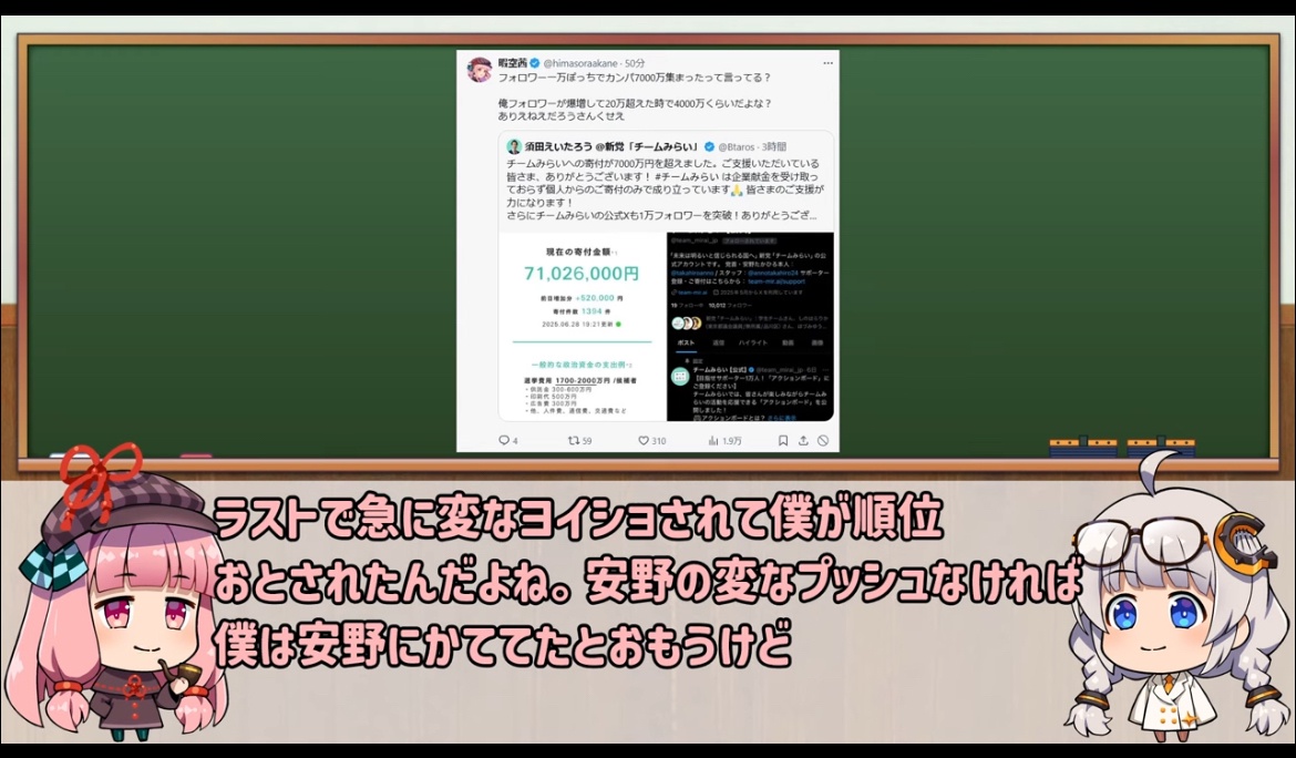 暇空茜ブチギレ「安野たかひろはうさんくさい。本当なら俺は都知事選で安野に勝てていた。安野とつるむ山田太郎もクソ」