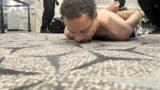 短髪で黒い半袖のTシャツと茶色の長ズボンを身につけていた。