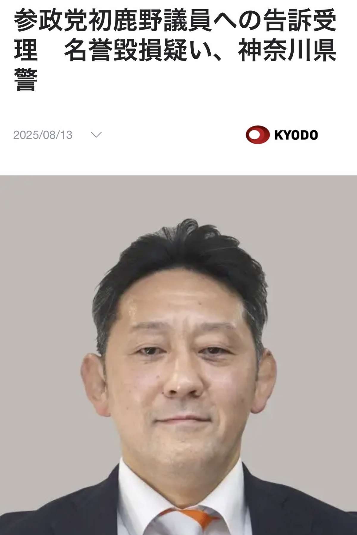 参政党の初鹿野裕樹参院議員がXに「たくさんの仲間が共産党員により殺害」などと投稿したとして、共産党神奈川県委員会が提出した名誉毀損の疑いでの告訴状について、神奈川県警は13日までに受理した。捜査関係者への取材で分かった。12日付。