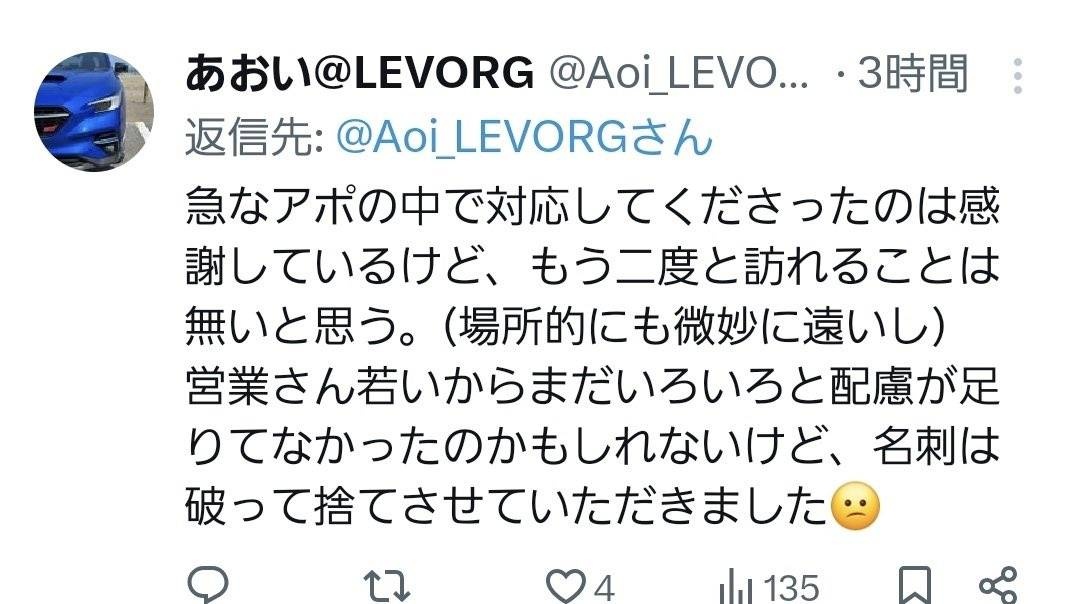 スバル車乗ってればどこの販売店行っても顧客だとでも思ってるのかな