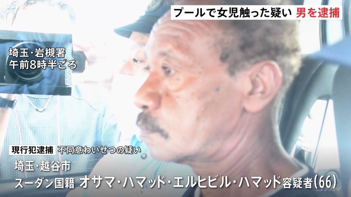 現行犯逮捕されたのはスーダン国籍のオサマ・ハマッド・エルヒビル・ハマッド容疑者(66)で、おととい午後2時ごろ、さいたま市岩槻区の県営プール「しらこばと水上公園」で、泳いでいた小学生の女子児童の体をさわるなどわいせつな行為をした疑いがもたれています。
