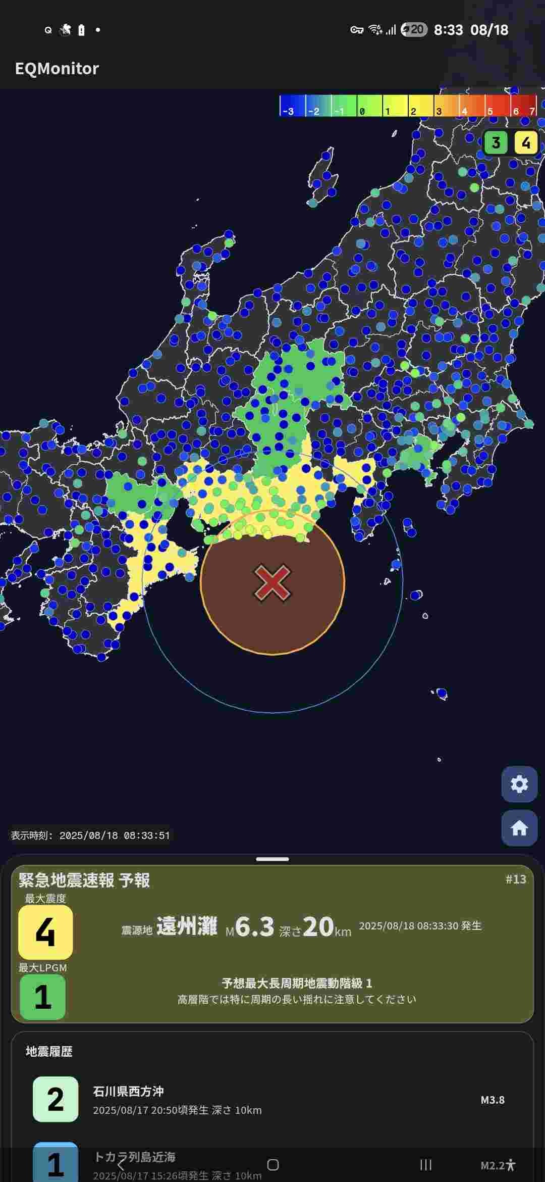 2025-08-18 08:33:27 遠州灘 M4.9 深さ30km 最大予測震度2 34.0N 137.9E